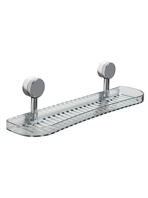 Tampa de acabamento em ABS cromado. Canopla e suportes de alumínio anodizado alto brilho. Estrutura interna de fixação de nylon. Prateleira em SAN incolor. Fixado por 4 parafusos Philips. Medidas em centímetros: LxAxP -> 35,50 x 8,50 x 9,00